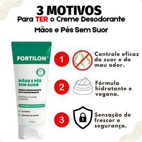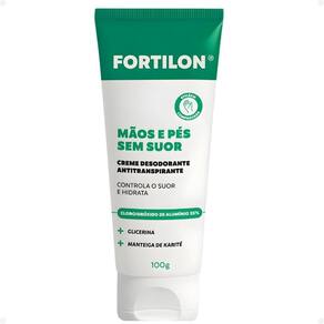 O Creme Desodorante Antitranspirante Dailus Fortilon Mãos e Pés Sem Suor 100g foi desenvolvido para controlar a transpiração excessiva nas palmas das mãos e plantas dos pés, proporcionando sensação de pele seca, confortável e protegida ao longo do dia. Sua fórmula combina ativos eficazes como Cloroidróxido de Alumínio 25%, Glicerina e Manteiga de Karité, para oferecer resultado visível e sensação de frescor prolongado. :contentReference[oaicite:1]{index=1}