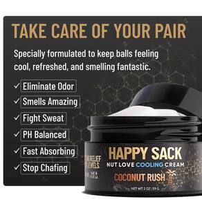 - Formulado com ingredientes comprovados. O creme refrescante Happy Sack Nut Love "Coconut Rush" é embalado com ingredientes que adoram bolas, como pepino, manteiga de karité e Avena Sativa para ajudar a promover bolas masculinas sem odor e cheiro. Além disso, aloe vera, pepino e camomila ajudam a evitar fricção na pele e coceira na bola.