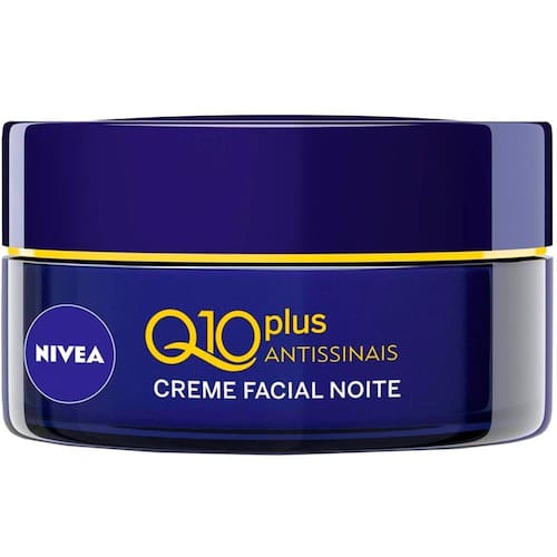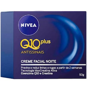 O Creme Facial Antissinais Noite Nivea Q10 Plus possui tecnologia com a coenzima Q10 e a Creatina, ativos poderosos que são encontrados naturalmente na pele, porém, com a idade seus níveis diminuem, deixando a pele com menos energia para renovar-se. Com o passar do tempo a pele fica mais propensa a rugas e sinais de idade. Nivea Q10 Plus Noite combina a exclusiva Tecnologia MaxCreatina Ativa e Q10, em uma poderosa fórmula que repõe e aumenta os níveis desses ativos nas camadas mais profundas da pele, estimulando a produção de energia e atuando efetivamente contra os sinais da idade.