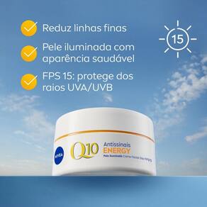 NIVEA Creme Facial Antissinais Q10 Energy Dia FPS 15 é um creme revolucionário projetado para proporcionar um rejuvenescimento eficaz da pele, reduzindo rugas visivelmente em apenas 4 semanas.