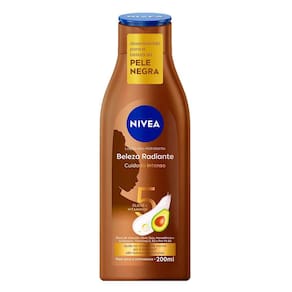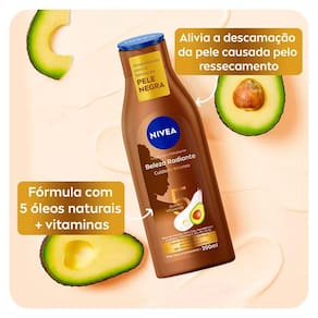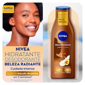 O Creme Hidratante Corporal Nivea Beleza Radiante Cuidado Intenso promove 48 horas de hidratação profunda e foi especialmente desenvolvido para a beleza da pele negra. Auxilia na reparação das áreas ressecadas aliviando a descamação da pele causada pelo ressecamento, realça o brilho natural e uniformiza o tom pele e reduz a aparência de marcas escurecidas. Possui fórmula enriquecida com 5 óleos naturais, abacate, oliva, soja, macadâmia e amêndoas, além de vitaminas E,B3 e Pro Vit B5.
