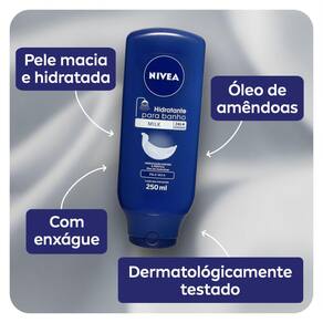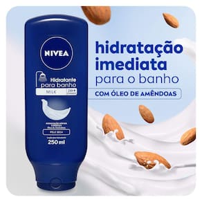 O Creme Hidratante Corporal Nívea Milk Para Banho Creme Desodorante proporciona uma pele saudável, macia, com toque suave e delicado, além disso, é rapidamente absorvido pela pele molhada e deixa uma fragrância deliciosa e agradável por todo o dia. Auxilia na hidratação da pele, oferecendo conforto e uma sensação agradável de pele nutrida por mais tempo, graça a sua fórmula enriquecida com óleo de amêndoas.