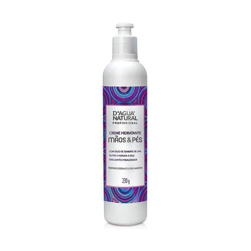 Creme Hidratante Mãos e Pés 230g D'agua Natural Desenvolvido para hidratar a pele das mãos e pés, com um toque suave e delicado. Este produto é um grande aliado das manicures e pedicures, pois ainda atua como emoliente para as cutículas e finalizador nutritivo para a pele. O óleo de semente de uva é rico em vitaminas D e E, além de possuir propriedades regeneradoras e revitalizantes. Sua combinação com as ceras emolientes do produto proporcionam uma profunda hidratação que amacia e facilita a renovação da pele. Perfuma suavemente e possui ação desodorante.