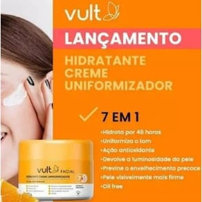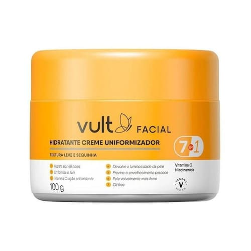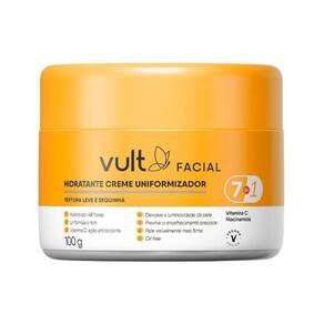Creme hidratante vult uniformizador 7 em 1 100g O hidratante creme uniformizador 7 em 1 de vult facial oferece uma hidratação de 48h e conta com vitamina c para uma ação antioxidante que previne envelhecimento precoce e niacinamida para uma ação uniformizadora que devolve a luminosidade da pele. Textura leve oil free, deixa a sua pele com a aparência mais saudável, jovem e iluminada.