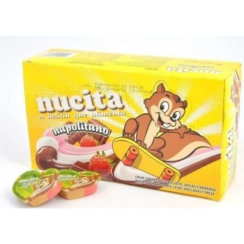 Caixa contendo 48 unidades de creme sabor chocolate e sabor artificial de leite, avelãs e morango com 10 gramas cada. Peso líquido 480 gramas.