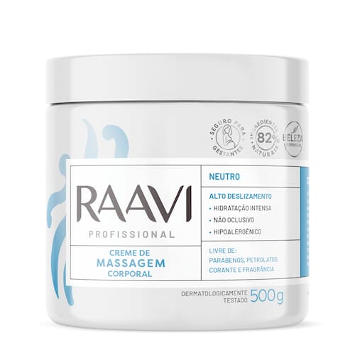 O Creme Para Massagem Corporal Raavi Neutro é indicado para os mais diversos tipos de massagem corporal. Sua exclusiva fórmula possui ação hidratante e excelente deslizamento, além de facilitar as manobras durante o uso e garantir um ótimo rendimento, conta com base neutra que permite adição de óleos essenciais ou vegetais conforme a necessidade. Promove maciez e auxilia a elasticidade da pele. Livre de fragrância, corantes, parabenos e petrolatos