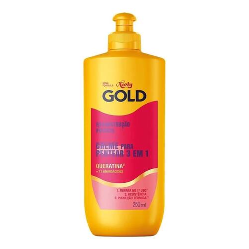 Creme para pentear 3 em 1 niely gold reconstrução potente 250mlo que é e para que serve o creme de pentear niely gold reconstrução potenteO creme de pentear niely gold reconstrução potente é um creme multifuncional desenvolvido para reparar e fortalecer os cabelos desde o primeiro uso. Sua fórmula brasileira enriquecida com queratina inteligente proporciona resistência aos fios, maciez e brilho, sendo ideal para qualquer transformação capilar. O produto é vegano e suas embalagens são recicláveis, produzidas com plástico 100% reciclado.Benefícios e diferenciais do creme de pentear niely gold reconstrução potenterepara profundamente os fios desde a primeira aplicação.Fortalece os cabelos, proporcionando 3x mais força.Proteção térmica que evita danos causados por ferramentas de calor.Filtro uv que protege contra os efeitos nocivos do sol.Brilho e maciez instantâneos e duradouros.Como usar o creme de pentear niely gold reconstrução potenteApós lavar os cabelos com shampoo e condicionador, aplique o creme nos cabelos úmidos, distribuindo do comprimento às pontas.Não é necessário enxaguar. Penteie e modele os fios como desejar.Para melhores resultados, utilize toda a linha niely gold reconstrução potente. Marca: Não Informado Ean: 7908785482659