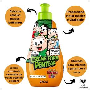O Creme para Pentear para Todos os tipos de cabelo, ajuda a hidratar os fios e a evitar os nozinhos indesejados, deixando os cabelos fáceis de pentear, modelados, brilhantes e com um delicioso cheirinho. Com extrato de camomila e frutas tropicais. Para todos os tipos de cabelo. Não irrita os olhos. Liberado para crianças a partir de 03 anos.