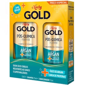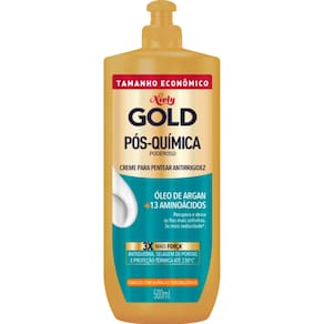 Creme de Pentear Óleo de Argan Pós Química Niely Gold foi desenvolvido especialmente para os cabelos quimicamente tratados, promove efeito regenerativo e reidrata os fios, proporcionando disciplina.Sua exclusiva fórmula possui MaxQueratina+, com 13 aminoácidos similares a queratina da fiba capilar, entre eles a Arginina, que age reestruturando os fios. Enriquecido com Óleo de Argan, um ativo com alta concentração de vitamina E e ômega 6, hidrata e promove efeito regenerativo aos cabelos que possuem escovas progressivas e processos químicos.Sua fórmula hidratante desembaraça os fios delicadamente e facilita o penteado, controlando o volume dos cabelos. Com filtro UV, protege os cabelos dos raios solares.