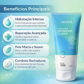 O Creme para Rachaduras c/ Ureia Labotrat Dia a Dia 100g é a solução ideal para o cuidado diário e hidratação intensa de pés, joelhos e cotovelos, ajudando a combater rachaduras e ressecamento. Desenvolvido especialmente para o cuidado intensivo de áreas ressecadas, o Creme para Rachaduras atua eficazmente nos pés, joelhos e cotovelos. Sua fórmula exclusiva, rica em ureia e óleo de amêndoas, proporciona uma hidratação profunda e duradoura, essencial para restaurar a saúde e a maciez da pele. Este creme é ideal para quem busca reduzir a aspereza e prevenir o surgimento de novas rachaduras, deixando a pele visivelmente mais suave e saudável. É um aliado perfeito para pessoas com rachaduras nos pés e outras áreas afetadas, promovendo um alívio e bem-estar no seu dia a dia.