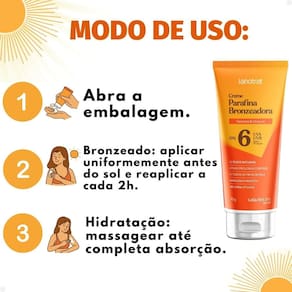 Para bronzeamento: Aplique o creme uniformemente sobre a pele limpa e seca, antes da exposição ao sol. Reaplique o produto a cada 2 horas, ou mais frequentemente se estiver transpirando ou nadando.
