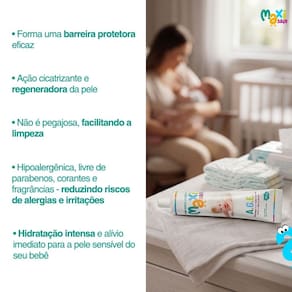 Pensando na segurança dos pequenos, a pomada é hipoalergênica, dermatologicamente testada e livre de parabenos, corantes e fragrâncias, reduzindo riscos de alergias e irritações. Um cuidado suave, seguro e confiável para o uso diário desde os primeiros dias de vida.