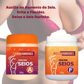 Creme Seios Aumenta Evita Flacidez e Deixa Durinho Seios A e F Lucy's 100g cada. 1 - Creme para os Seios A Lucy's - 100g.(AUXILIA NO AUMENTO DOS SEIOS) * Contém Commipheroline e Adipofill ativos que estimulam o aumento dos adipócitos.(Auxilia no aumento do Seios).Creme de Beleza Hidratante.Modo de usar: Aplicar por todo o seio, em suaves movimentos pelo menos uma vez ao dia (preferencialmente 30 minutos antes de dormir).Precauções: manter fora do alcance de crianças, em caso de contato com os olhos lavar com água em abundância. Manter em local seco e fresco.Não ingerir. 2 - Creme para Firmar os Seios F - 100g.CREME PARA FIRMAR OS SEIOS * Contém Raffermine de ação Firmadora e tonificadora do tecido.* Auxilia no Tratamento da Flacidez.* Auxilia no Tratamento de Seios mais Firmes.Contém: Raffermine de ação Firmadora e tonificadora do tecido.Creme de Beleza Hidratante.Modo de usar: Aplicar por todo o seio, em suaves movimentos pelo menos uma vez ao dia (preferencialmente 30 minutos antes de dormir).Precauções: manter fora do alcance de crianças, em caso de contato com os olhos lavar com água em abundância. Manter em local seco e fresco. Não ingerir. Embalagem Contém: 2 Itens.1 - Creme para os Seios A Lucy's - 100g.1 - Creme para Firmar os Seios F Lucy's - 100g. ENVIO LOGO APÓS CONFIRMAÇÃO DO PGTO.