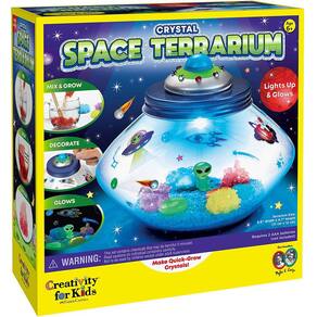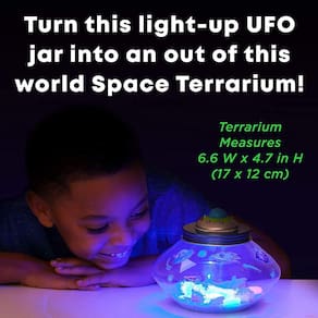 Decolar em uma aventura criativa de ciência espacial com criatividade para o Terrarium espaço de cristal kids! Com este kit de artesanato STEAM para crianças, sua missão espacial começa quando você cria um brilho no terrário de cristal escuro que tem a forma de um OVNI. Tudo o que você precisa para completar este projeto de artesanato está incluído, basta adicionar imaginação! O kit de terrário espacial de crescimento de cristal vem com rochas de cristal crescentes, pó de cultivo de cristal, jarra de plástico (4,75 H x 6,5 W), adesivos espaciais coloridos, adesivos de constelação brilhante no escuro, rochas brilhantes, recipiente de medição de plástico, bastão de agitação de madeira, adesivo macio, ponto pegajoso de espuma, mini alienígena brilhante no escuro, adesivos de strass e rochas espaciais (requer 2 baterias AAA - não incluídas). As rochas brilhantes, estatuetas alienígenas e adesivos de constelação iluminarão seu quarto durante o dia e a noite! Embora este ofício seja uma maneira divertida de ser criativo, também é uma atividade stem educacional! Aprenda sobre reações químicas se misture e faça seus próprios cristais de crescimento rápido. Basta adicionar água quente e ver os cristais crescerem em apenas 24 horas! Este brinquedo científico é uma atividade STEM envolvente, divertida e educativa para crianças que estão interessadas em ciência e espaço exterior, ao mesmo tempo em que inspiram a criatividade à medida que personalizam seu próprio planeta falso! Desde 1976, a Criatividade para Crianças tem orgulhosamente feito experiências divertidas e criativas hoje em dia para nutrir a confiança das crianças para a vida. Este kit de cultivo de cristal para crianças possui artesanato e artesanato não tóxicos e é recomendado para crianças de 6 anos.