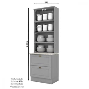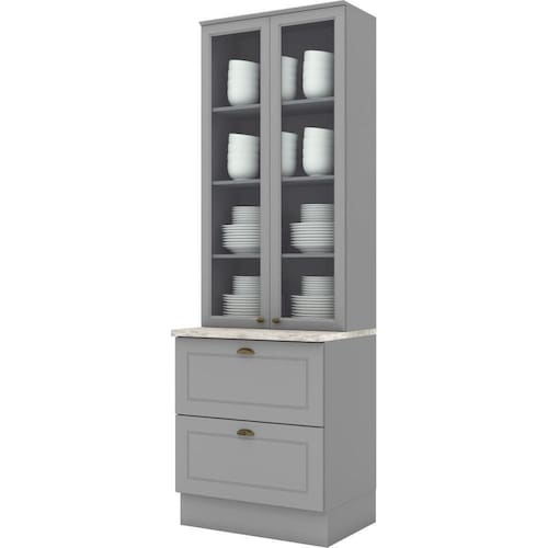 Cristaleira Americana, 2 Portas com quatro prateleiras, duas gavetas, produto 100 MDF, porta com usinagem em baixo relevo, puxadores em formato de concha com acabamento Zamac ouro velho, possui dobradicas de 35mm com amortecimento, a sua instalacao pode ser feita tanto com o uso dos rodapes ou suspensa. Um conceito inspirado nas classicas cozinhas estilo americano, seu design contemporaneo embeleza qualquer ambiente. Projetado para proporcionar praticidade e funcionalidade ao uso. Disponibiliza de varias opcoes de modulos que possibilitam diversas composicoes lineares, este produto foi desenvolvido para atender os mais criteriosos usuarios aliando funcionalidade com elegancia.