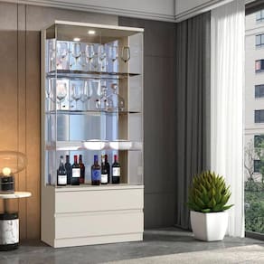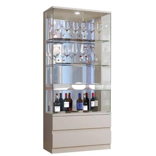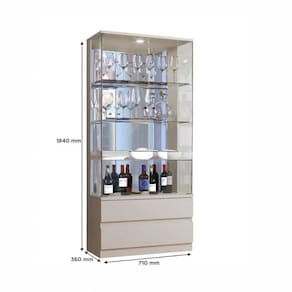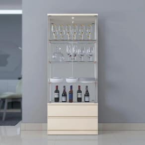 Cristaleira 2 Portas De Vidro 2 Gavetas E 3 Prateleiras Off White Cristaleira 2 Portas de Vidro 2 Gavetas e 3 Prateleiras de Vidro Diamante Mavaular Caracteristicas Luminaria LED: Bivolt Prateleira de vidro temperado Puxador aluminio bronze Espelho para dar amplitude ao ambiente Lateral de vidro temperado Base macica de 25mm Tampo macico de 25mm Gavetas com corredicas telescopicas