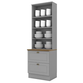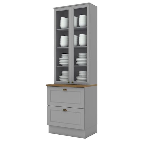 Cristaleira 2 Portas E 2 Gavetas Americana Cinza Com Tampo Nature - Móveis Henn Cinza/nature Cristaleira 2 Portas e 2 Gavetas Americana - Móveis Henn Os módulos da Cozinha Modulada Americana é uma linha clássica e atemporal, pensada para transformar esse ambiente no cantinho preferido do seu lar. Produzida 100% em MDF, na cor branco, uma pintura UV fosca, todas as portas e gavetas contam com usinagem em baixo relevo e os puxadores em zamac ouro velho garantem um charme extra a qualquer ambiente. ESPECIFICAÇÕES: - Estrutura 100% MDF - Acabamento UV - 2 Portas - Dobradiças de 35mm com amortecimento - 2 Gavetas - Corrediças telescópicas - Puxadores em zamac ouro velho - Usinagem em baixo relevo - Tampo BP/MDP - Opção de instalação sem pés, suspensa - Amplo espaço interno