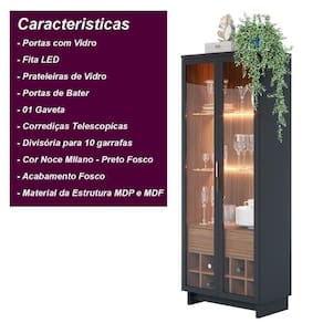 Material: MDP e MDF | Cor: Preto Fosco / Noce Milano | Cômodo Indicado: Sala de jantar | Dimensões da Cristaleira (A X L X P): A 71,6 X L 175,6 X P 40,0 | Possui Prateleira: Sim | Quatidade de Prateleira: 2 | Possui Gaveta: Sim | Quantidade de Gavetas: 1 | Tipo da Corrediça da Gaveta: Telescópica | Possui portas: Sim | Quantidade de portas: 2 | Tipo de Porta: 2 Bater | Possui porta Basculante: Não | Material da Dobradiça ou Corrediça da Porta: Metálica | Possui Nichos: Não | Número de Nichos: 0 | Possui pés: Não | Número de Pés: 0 | Material dos Pés: Sapata | Possui Espelho: Não | Quantidade de espelhos: 0 | Acompanha Lâmpada: Sim | Tipo de Lâmpada: Fita de LED | Voltagem: Bivolt | Possui Led: Sim | Peso do Produto (Kg): 55.16 | Altura do Produto (cm): 71.599999999999994 | Largura do Produto (cm): 175.6 | Comprimento do Produto (cm): 40 | Descrição do Tamanho: 71,6x175x40 cm | Nome do Simples no Fornecedor: Cristaleira 2 Portas Guanabara | Garantia do Fabricante: 90 dias | Instruções/Cuidados:
