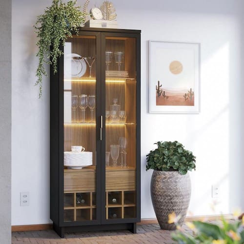 Com design minimalista, a Cristaleira Guanabara é uma ótima escolha para compor salas de estar ou jantar. Desenvolvida para armazenar e organizar utensílios de louças, possui duas prateleiras de vidro, iluminadas por fitas de Led, que são ideais para destacar e valorizar aquela coleção de taças ou copos especiais. Além disso, possui uma adega com espaço para 10 garrafas e uma gaveta interna para guardar travessas e aparelhos de jantar. Seu destaque fica por conta de suas portas em vidro, estilo retrô, que permitem que todo conteúdo interno fique à vista, garantindo assim, um toque especial ao móvel e maior praticidade para o dia a dia.