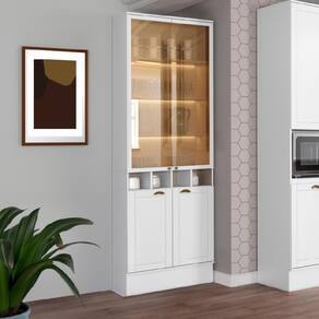 Os módulos da Cozinha Milla destacam-se pela versatilidade e criatividade, possibilitando diversas montagens em ambientes variados. A Cristaleira (2 portas + 2 portas de vidro) da Cozinha Milla, apresenta portas usinadas que traduzem a essência e modernidade do estilo clássico. As cristaleiras são elementos que complementam a composição das cozinhas, contribuem na organização e resultam em mais espaço para armazenamento. Além disso, possui vidros que traduzem o estilo provençal, bem clássico, podendo revelar parcialmente o interior do móvel. Itens que compõe a cristaleira, como: puxadores em metal no acabamento ouro velho, vidro, matéria-prima em BP ou MDF, portas em MDF 15mm com usinagem e dobradiças com amortecimento que proporcionam um fechamento suave, criando uma harmonia fantástica com os demais itens dentro do espaço em que está inserida. Esses atributos combinam funcionalidade e estética, tornando a linha Milla uma escolha sofisticada e prática para cozinhas modernas e bem organizadas.