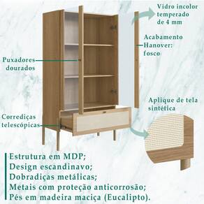 Cristaleira 2 Portas de Vidro 1 Gaveta e Pés em Madeira 27963, clássica, minimalista e funcional, o móvel que irá decorar seu ambiente com elegância e requinte na medida. Estrutura e prateleiras em MDP de 15mm, costas em HDF de 3mm e vidro de 4mm, conta com acabamento BP, gaveta de corrediças telescópicas e aplique de tela sintética, dando ao produto um traço clássico e artesanal. Possui também 02 portas de vidro temperado incolor e dobradiças metálicas. Tanto a gaveta quanto as portas, possuem puxadores de poliestireno na cor dourada, seus pés são de madeira maciça (eucalipto) com acabamento PU e sapatas emborrachadas. O peso suportado por cada prateleira e pela gaveta é respectivamente: 5kg e 3kg, peso máximo suportado: 18kg. Com seus traços suaves e acolhedores, ela irá conferir design e luxo ao seu ambiente. Este móvel chegará na sua casa separado em 02 volumes.