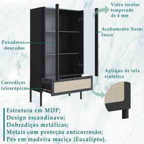 Cristaleira 2 Portas de Vidro 1 Gaveta e Pés em Madeira 27963, clássica, minimalista e funcional, o móvel que irá decorar seu ambiente com elegância e requinte na medida. Estrutura e prateleiras em MDP de 15mm, costas em HDF de 3mm e vidro de 4mm, conta com acabamento BP, gaveta de corrediças telescópicas e aplique de tela sintética, dando ao produto um traço clássico e artesanal. Possui também 02 portas de vidro temperado incolor e dobradiças metálicas. Tanto a gaveta quanto as portas, possuem puxadores de poliestireno na cor dourada, seus pés são de madeira maciça (eucalipto) com acabamento PU e sapatas emborrachadas. O peso suportado por cada prateleira e pela gaveta é respectivamente: 5kg e 3kg, peso máximo suportado: 18kg. Com seus traços suaves e acolhedores, ela irá conferir design e luxo ao seu ambiente. Este móvel chegará na sua casa separado em 02 volumes.