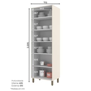 FICHA TÉCNICA: Cor Interna: Trama Acabamento: Na versão Duna com Cristal a Pintura é UV Texturizada e na versão Off White a Pintura é UV Escala de Brilho: Na versão Duna com Cristal é Fosco e na versão Off White é Brilho Material do Fundo: MDF Material Principal: MDF Qtd. Gavetas: Não possui Qtd. Portas: 4 Und Material da Dobradiça: Metálica de 35mm Material do Puxador Porta: Alumínio Tipo Porta: Bater Qtd. Prateleiras: 4 Und Peso Máximo por Prateleira: Cada prateleira suporta até 8 Kg, a carga deve ser distribuída uniformemente. Material da Prateleira: MDF Possui Vidro: Sim, vidro Reflecta nas portas Possui espaço para Quantos Fornos: Não possui Estilo de Paneleiro: Cristaleira Qtd. Pés: 4 Und Pés Reguláveis: Sim Material Pés/Rodapé: MDF Altura Pés/Rodapés: 14,5 Cm Produto Suporte até -Kg-: 55 Kg Pode ser Montado Suspenso: Não Medidas Conjunto Montado: 220,5 x 71,5 x 51,5 Cm Peso Conjunto Montado: 60 Kg