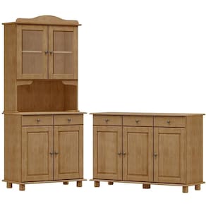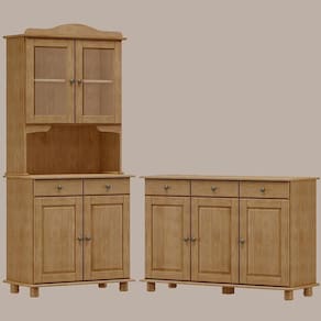 Cristaleira e Balcão, um conjunto projetado para quem busca móveis que combinam elegância e funcionalidade para complementar sua decoração. Produzido em madeira maciça de pinus de reflorestamento, sua estrutura robusta garante durabilidade e resistência. A Cristaleira conta com 04 portas, sendo 02 de vidro incolor, e 02 gavetas, e o Balcão com 03 portas e 03 gavetas. As portas possuem dobradiças com amortecimento, e as gavetas corrediças telescópicas, que proporcionam abertura suave e silenciosa. Com pintura acetinada com verniz PU e UV, que realça a beleza natural da madeira enquanto protege contra desgastes do dia a dia e puxadores metálicos que adicionam um toque moderno ao design clássico do produto. Os pés torneados em madeira maciça garantem estabilidade e charme artesanal. Oferecem amplo espaço interno, perfeitos para organizar louças, objetos decorativos ou itens de sua preferência. Estes móveis chegarão em sua casa separados em 03 volumes.