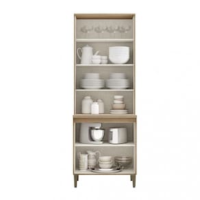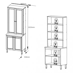 Características: 2 Portas com moldura 2 Portas com vidro, dobradiças metálicas 35mm com sistema de amortecimento, 1 Prateleira removível 4 Tampos de 15mm, 01 tampo de 30mm, 2 Puxadores ponto e 0 puxadores concha 4 Pés reguláveis, sistema de montagem com parafusos e cavilhas.