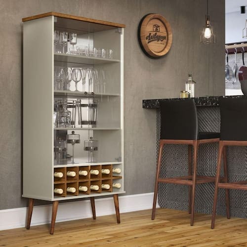 Feito em MDF. Contém 4 prateleiras, adega com 12 nichos para acomodar garrafas, 2 portas de vidro temperado 4mm e espelhos internos.