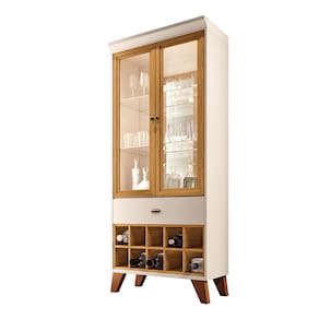 A Cristaleira Adega Sala de Jantar Yves Off White/Cinamomo é uma excelente escolha para quem deseja exibir seus itens de forma sofisticada e segura. Ela possui 2 portas de vidro emolduradas em MDF, 2 prateleiras de vidro, fundo com espelho, e também moldura superior e pés de madeira levemente angulados realçando o estilo retrô do móvel. Contém também nicho adega adicionando ainda mais funcionalidade à cristaleira, permitindo que você organize e exiba suas bebidas favoritas de forma prática e elegante. O fundo de espelho não só amplia visualmente o ambiente, criando uma sensação de maior espaço, como também realça a beleza dos objetos expostos. O vidro permite que seus objetos de decoração, louças e taças deixem visíveis de maneira elegante. Os puxadores em poliestireno com acabamento metálico fosco são uma excelente escolha para o design da cristaleira. Esse móvel não é só funcional, como também traz um charme único, elevando a decoração e transformando qualquer espaço com seu estilo refinado. Não perca a chance de garantir a sua!