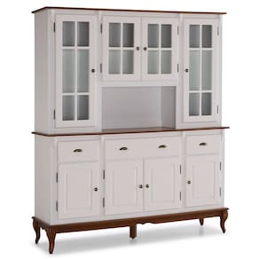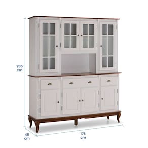 Suas 8 portas proporcionam acesso fácil e organizado ao seu amplo espaço interno, as portas superiores possuem acabamento em vidro, garantindo que suas louças fiquem a mostra e ajudem na decoração. Além disso, a presença de três gavetas adiciona uma camada de praticidade, oferecendo espaço adicional para organizar itens essenciais com facilidade. O nicho central é o ponto focal, destacando-se como um espaço dedicado para exibir itens especiais, adicionando um toque pessoal à peça.