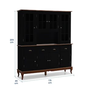 Suas 8 portas proporcionam acesso fácil e organizado ao seu amplo espaço interno, as portas superiores possuem acabamento em vidro, garantindo que suas louças fiquem a mostra e ajudem na decoração. Além disso, a presença de três gavetas adiciona uma camada de praticidade, oferecendo espaço adicional para organizar itens essenciais com facilidade. O nicho central é o ponto focal, destacando-se como um espaço dedicado para exibir itens especiais, adicionando um toque pessoal à peça.
