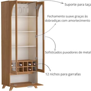 Com amplo espaço interno, a cristaleira oferece nichos para garrafas, suporte para taças e prateleiras ajustáveis para acomodar tudo que você precisa.
