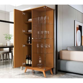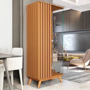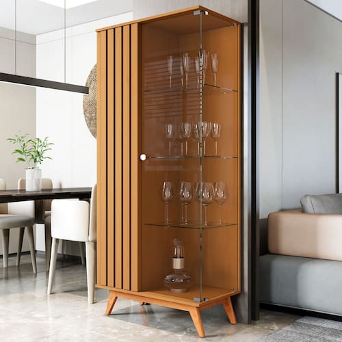 Cristaleira Moderna com Estrutura Lateral e Portas Ripadas de 24mm. Porta, lateral e prateleira de vidro temperado 4mm. Pés e travessas em madeira maciça. Produto entregue desmontado, montagem de responsabilidade do cliente. Acompanha uma cristaleira, kit ferragens e um manual de montagem.