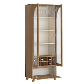 Características: 12 Nichos para garrafas 2 Portas de Vidro temperado, e uma porta basculante com amortecedor 3 Prateleiras internas, sendo a 1ª e 3ª com regulagem de altura. Acabamento em pintura UV Detalhe arredondado nas portas Dobradiças com amortecedor Estrutura de MDF/MDP de 15mm Puxadores de metal Suporte para taças