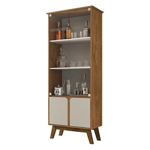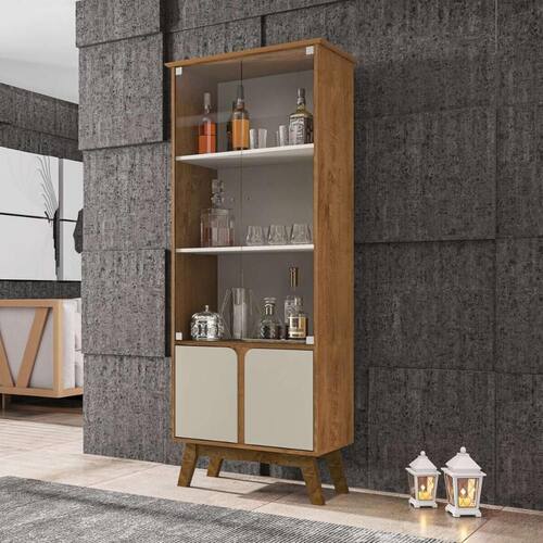 - Produzida em MDP (15mm): maior durabilidade e resistência. - Tampo em MDF (5mm) chanfrado em ângulo. - Acabamento em pintura UV. - 2 portas com fecho toque magnético e cantos arredondados: praticidade no manuseio e elegância. - 2 portas em vidro (4mm) com puxador em PVC cromado: amplo espaço para exibir todas as suas louças. - Prateleiras internas superiores suportam até 8kg. - Prateleira interna inferior suporta até 10kg. - Pés em madeira de pinus no estilo retrô: maior estabilidade ao móvel.