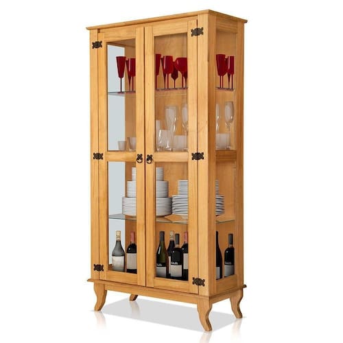 Características da Cristaleira de Madeira Maciça 2 Portas de Vidro Luma: - Estrutura em madeira maciça taeda de reflorestamento; - Vidro nas portas e também nas laterais com 3mm; - Base em madeira maciça; - Puxadores e dobradiças coloniais de ferro; - Pés de madeira em estilo colonial; - Prateleiras em vidro 4 mm; - Fechamento do fundo em compensado de madeira; - Espaço entre as prateleiras de 38 cm; - Peso Suportado por Prateleira: 5kg - Não acompanha objetos decorativos; - Montagem por conta do comprador;