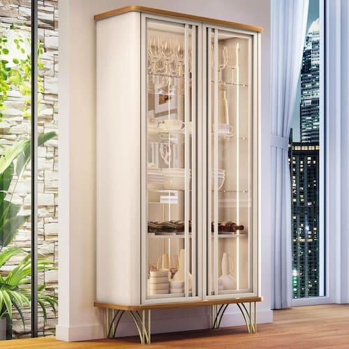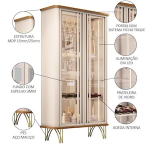 Ela possui portas de vidro emolduradas e cantos arredondados, que conferem um design moderno e harmonioso. O sistema de abertura e fecho toque facilita o manuseio e evita marcas de dedos nas portas. A iluminação LED nas laterais cria um efeito luminoso e valoriza os itens expostos. A Cristaleira conta ainda com três prateleiras de vidro de 6mm de espessura, e uma adega com divisórias para seis garrafas, perfeita para organizar seus vinhos favoritos. O fundo da cristaleira é revestido com espelhos de 3mm, que ampliam o espaço e refletem a luz. A estrutura da cristaleira é feita de MDF de alta qualidade, resistente e durável. Os pés de aço maciço em tom dourado complementam o visual sofisticado e garantem a estabilidade do móvel. A Cristaleira de Vidro é uma peça versátil e funcional, que pode ser usada na Sala De Jantar, na Sala De Estar ou no hall de entrada, dando um toque de charme e requinte ao seu ambiente.