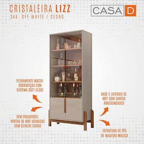 Marca: Casa D; Linha: Sala; Modelo: Cristaleira Lizz; Material da estrutura: MDF de 15 mm e MDP 15 mm com pés de madeira maciça e vidro temperado de 15 mm; Acabamento: Pintura Print Wood; Altura: 179,5 cm; Largura: 85 cm; Profundidade: 36 cm; Quantidade de portas: 04, inferiores com sistema Soft-Close (fechamento macio); Material de dobradiças: Metálicas (Soft-Close); Quantidade de gavetas: Não se aplica; Com corrediças: Não se aplica; Material das corrediças: Não se aplica; Com puxador: Sim, detalhe curvo; Material do puxador: Embutido; Quantidade prateleiras: 04; Com rodízios: Não se aplica; Condição do item: Novo; É kit: Não; Peso suportado: 40 kg; Requer montagem: Sim (kit montagem incluso); Altura da embalagem: 14,3 cm; Largura da embalagem: 43,2 cm; Comprimento da embalagem: 166 cm; Peso: 42,4 kg; Embalagem do envio: Papelão e plástico. Informações adicionais: - Os objetos que ambientam as fotos não acompanham o produto; - O produto será entregue desmontado; - É de inteira responsabilidade do cliente a montagem do produto e/ou instalação, custos de transporte por escadas e/ou elevadores, guincho ou içamento, assim como possíveis irregularidades provenientes de manuseio inadequado; - Embora o produto acompanhe o manual de montagem, verifique a complexidade antes de decidir montá-lo sozinho, recomendamos que contrate um profissional de sua confiança; - Fique atento, nossas cores podem sofrer alterações dependendo do seu monitor; - ANTES DE MONTAR O SEU PRODUTO, certifique-se que todas as instruções dispostas no manual, bem como todas as ferragens descritas, estejam presentes dentro da embalagem. Verifique se há alguma peça danificada, caso esteja, prestaremos a devida assistência dentro do prazo da garantia.