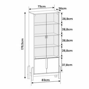 Marca: Casa D; Linha: Sala; Modelo: Cristaleira Lizz; Material da estrutura: MDF de 15 mm e MDP 15 mm com pés de madeira maciça e vidro temperado de 15 mm; Acabamento: Pintura Print Wood; Altura: 179,5 cm; Largura: 85 cm; Profundidade: 36 cm; Quantidade de portas: 04, inferiores com sistema Soft-Close (fechamento macio); Material de dobradiças: Metálicas (Soft-Close); Quantidade de gavetas: Não se aplica; Com corrediças: Não se aplica; Material das corrediças: Não se aplica; Com puxador: Sim, detalhe curvo; Material do puxador: Embutido; Quantidade prateleiras: 04; Com rodízios: Não se aplica; Condição do item: Novo; É kit: Não; Peso suportado: 40 kg; Requer montagem: Sim (kit montagem incluso); Altura da embalagem: 14,3 cm; Largura da embalagem: 43,2 cm; Comprimento da embalagem: 166 cm; Peso: 42,4 kg; Embalagem do envio: Papelão e plástico. Informações adicionais: - Os objetos que ambientam as fotos não acompanham o produto; - O produto será entregue desmontado; - É de inteira responsabilidade do cliente a montagem do produto e/ou instalação, custos de transporte por escadas e/ou elevadores, guincho ou içamento, assim como possíveis irregularidades provenientes de manuseio inadequado; - Embora o produto acompanhe o manual de montagem, verifique a complexidade antes de decidir montá-lo sozinho, recomendamos que contrate um profissional de sua confiança; - Fique atento, nossas cores podem sofrer alterações dependendo do seu monitor; - ANTES DE MONTAR O SEU PRODUTO, certifique-se que todas as instruções dispostas no manual, bem como todas as ferragens descritas, estejam presentes dentro da embalagem. Verifique se há alguma peça danificada, caso esteja, prestaremos a devida assistência dentro do prazo da garantia.