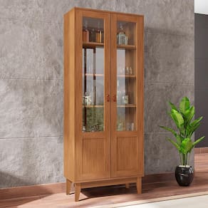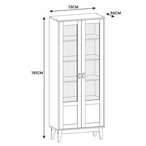 ESPECIFICAÇÕES: Estrutura em MDP e MDF Pintura UV 2 Portas Dobradiças metálicas Portas em MDF 18mm Puxadores de alça de couro ecológico Vidro das portas 4mm espessura Interna com prateleiras Chapéu e base em MDP 15mm Pés de madeira maciça