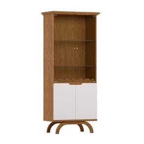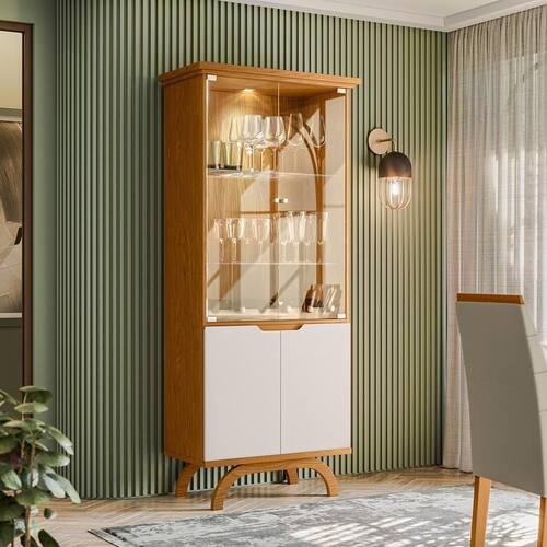 Ela conta com 4 portas sendo 2 de vidro e 2 de madeira, 2 pés, e 2 prateleiras.