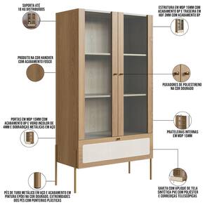 A robustez da estrutura e dos pés metálicos estilo industrial contrastam com a delicadeza das portas de vidro e com o aplique de telinha sintética na gaveta, dando origem a uma cristaleira com traço artesanal, suave e convidativo. Seja para compor a sala de jantar ou até mesmo a sala de estar ou área gourmet, essa cristaleira multifuncional tanto servirá de apoio no momento das refeições, como garantirá organização e fácil acesso.