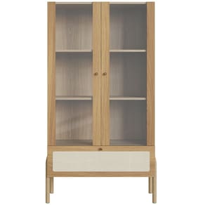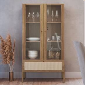 A robustez da estrutura e dos pés em madeira maciça contrastam com a delicadeza das portas de vidro e com o aplique de telinha sintética na gaveta, dando origem a uma cristaleira com traço artesanal, suave e convidativo. Seja para compor a sala de jantar ou até mesmo a sala de estar ou área gourmet, essa cristaleira multifuncional tanto servirá de apoio no momento das refeições, como garantirá organização e fácil acesso.