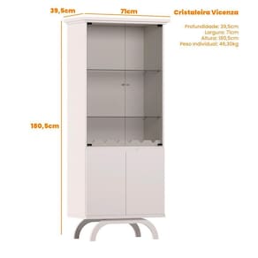 A Cristaleira Vicenza conta com pés em MDF de 25mm, prateleiras e portas em vidro de 3mm.