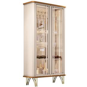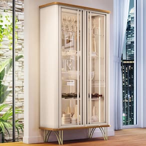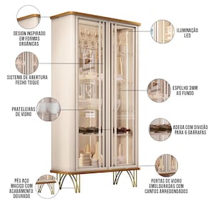 A Cristaleira Síria é o que falta pra sua sala de jantar! Com acabamentos impecáveis, torna o espaço mais elegante e garante grande destaque para a composição dos móveis na ambientação. O espelho ao fundo e iluminação led, expressa sofisticação e modernidade, que expõe com ainda mais graciosidade as louças, cristais, taças e decorações em geral. O design orgânico arredondado mesclado com o estilo industrial é uma opção moderna que traz leveza e harmonia ao ambiente. Os pés em aço com acabamento dourado conferem um toque de luxo e requinte, contrastando com a transparência das portas de vidro. Pode ser disposta na sala de jantar, de estar, cozinha, escritório ou até em corredores e espaços de circulação, aposta perfeita para quem deseja inovar sem erro!