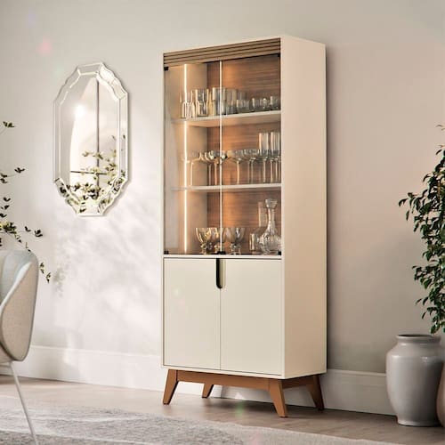 A Cristaleira Paraty une elegância e modernidade. Possui travessa em MDF com frisos sofisticados, perfil de LED slim embutido que valoriza os objetos e facilita a visualização mesmo com pouca luz. As portas de vidro pivotantes trazem leveza e praticidade, ideais para exibir cristais, taças, bebidas ou itens decorativos. Os puxadores embutidos tipo cava garantem um design minimalista e funcional, enquanto os pés em MDF asseguram durabilidade e ótimo acabamento. Versátil, adapta-se perfeitamente a ambientes residenciais ou comerciais, equilibrando estilo contemporâneo e atemporal. Acabamento da Porta: Pintura UV Acabamento da Prateleira: Pintura UV Acabamento dos Pés: Pintura Acompanha Lâmpada: Não Altura dos Pés: 18 cm Altura Máxima dos Pés: 18.0000 Ambiente Principal: Sala de Jantar codigo_ean: 7900288288608 Complexidade da Montagem: Alta: deve ser montado por um montador especializado Cor: Off White / Amendoa Cor da Porta: Bege Cor do Produto: Off White / Amêndoa Cor dos Pés: Marrom Escala de Brilho: Semi-Brilho Escala de Brilho da Porta: Semi-Brilho Informações Complementares: POSSUI TRAVESSA EM MDF COM FRISOS, PERFIL DE LED SLIM NA LATERAL, PORTAS DE VIDRO PIVOTANTE, PUXADORES MODELO CAVA(EMBUTIDO NA PORTA), PÉS EM MDF Itens Inclusos: 1 Cristaleira e Kit Ferragens Linha ou Coleção: Paraty Manual de Montagem e Instalação: https://product-hub-prd.madeiramadeira.com.br/748277050/documents/dfeec2aa-f560-4382-8c00-bc1dca5f1b873298141277817617436972273.pdf Marca: Mobler Material da Porta: MDP Material da Prateleira: MDP Material Principal: MDF/MDP Necessita Montagem: Sim Origem do Produto: Nacional Peso: 36,7 kg Peso Máximo por Prateleira: 3 kg Porta Taças: Não Possui Adega: Não Possui Espelho: Não Possui Gavetas: Não Possui iluminação: Sim Possui Nicho: Não Possui Pés: 04 Possui Portas: Sim Possui Prateleiras: Sim Quantidade de Prateleiras: 03 Prateleiras Recomendações de Uso, Manutenção e Limpeza: PARA CONSERVAR A APARÊNCIA E A DURABILIDADE DO PRODUTO UTILIZAR PANO MACIO E ÚMIDO, NÃO USAR SOLVENTES OU ABRASIVOS Sapatas Niveladoras: Sim Sistema de Montagem: PREGOS, PARAFUSOS E CAVILHAS Suporta Até (kg): 20 kg Tipo de Dobradiça/Corrediça da Porta: Metálica Tipo de Porta: Bater Tipo de Puxador da Porta: Externo