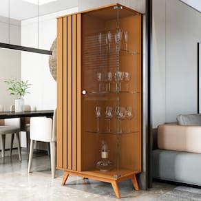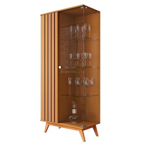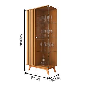 Feita em MDP 24mm. Contém 1 porta com detalhes ripados e 1 de vidro e 3 prateleiras.