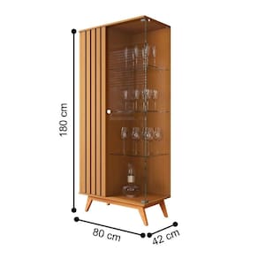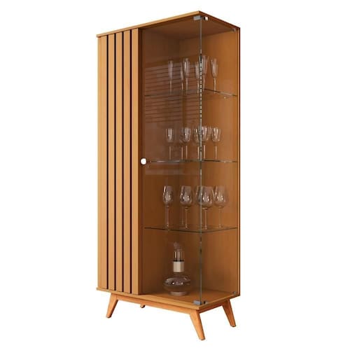 Feita em MDP 24mm. Contém 1 porta com detalhes ripados e 1 de vidro e 3 prateleiras.